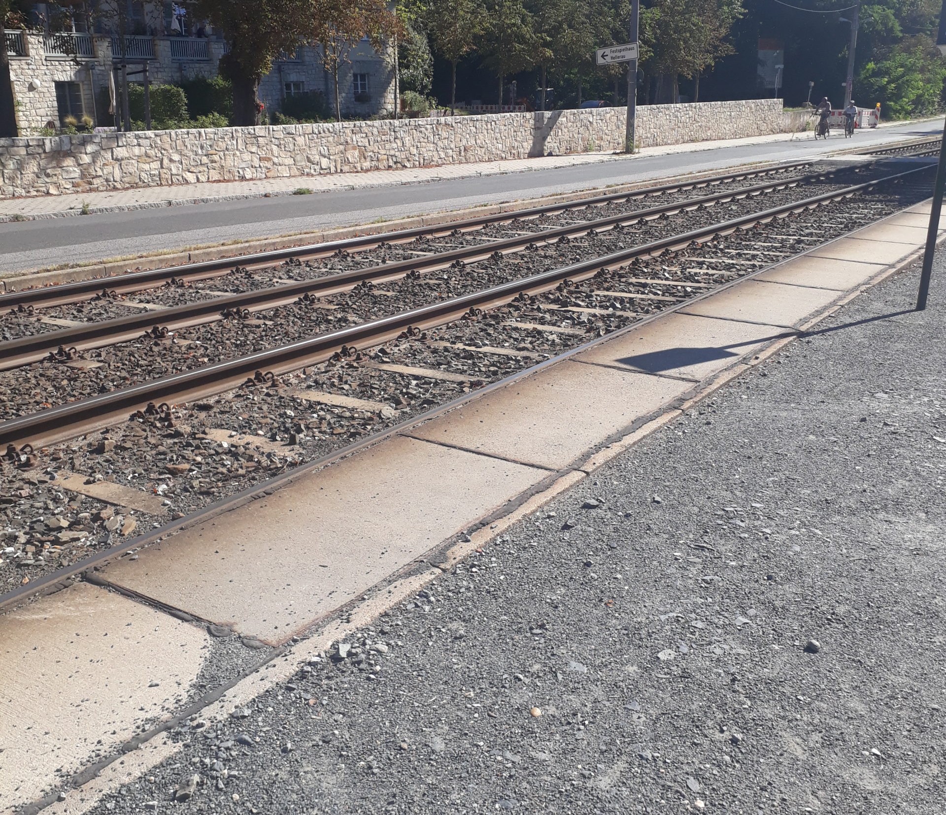 Der Untergrund an der Haltestelle „Festspielhaus Hellerau“ ist mit Kies ausgestattet, der die Mobilität für Rollstuhlfahrer*innen einschränken kann. Eine ca. 6 cm hohe Bordsteinkante und die befahrene Hauptstraße müssen überquert werden. Es gibt keine Ampel. Von der Haltestelle „Festspielhaus Hellerau“ aus sind es ca. 330 Meter bis zum Festspielhaus. Der Weg ist zum Teil uneben und auf Grund von Schotterbelag nicht gut berollbar.