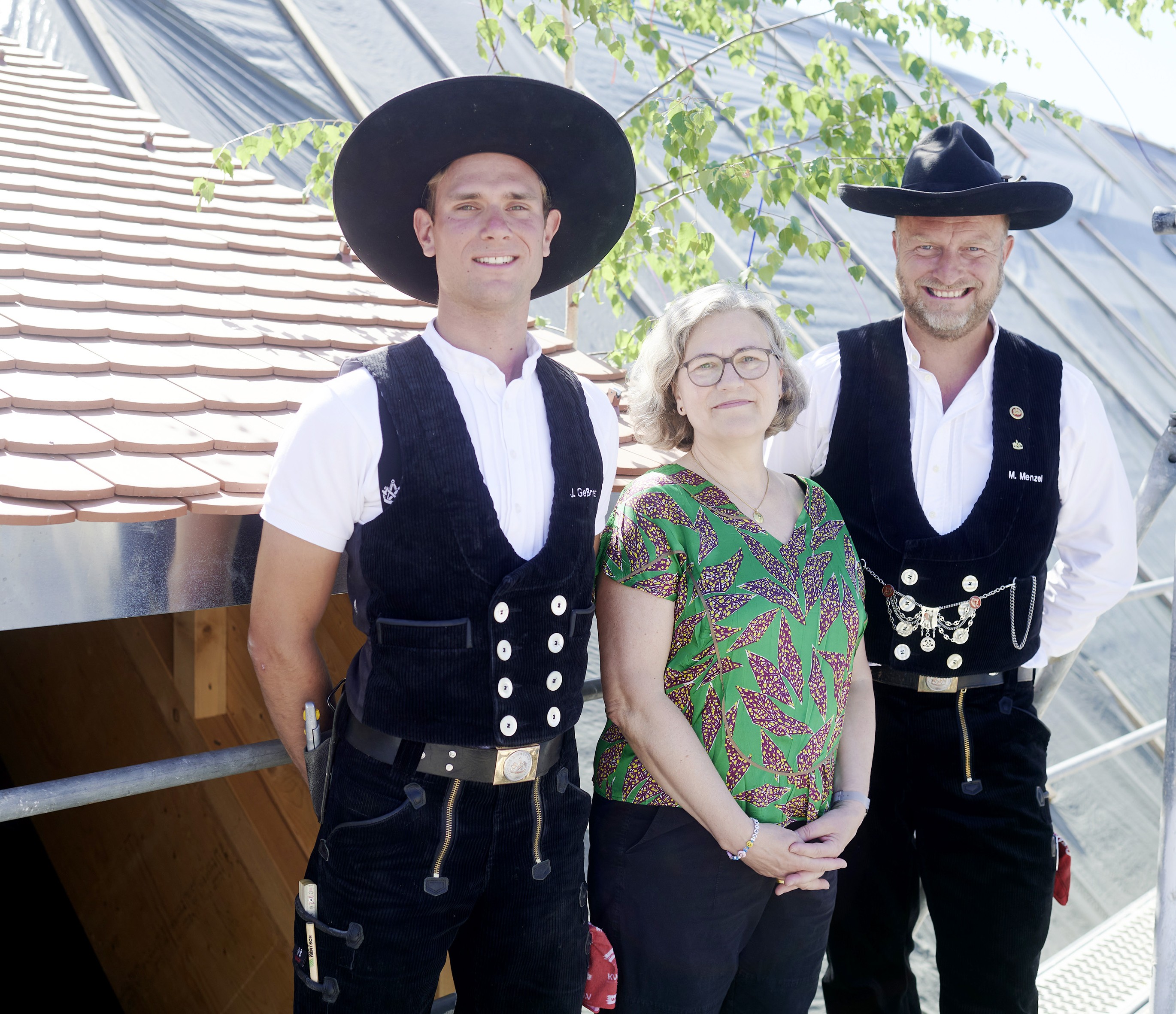 Mit der Fertigstellung der 14 Dachgauben sind die Rohbauarbeiten am Ostflügel des Festspielhaues Hellerau nun weitestgehend abgeschlossen. Diesen Meilenstein nahm Baubürgermeister Stephan Kühn zum Anlass und lud alle Projektbeteiligten am 18. Juli 2022 zum Richtfest ein. Intendantin Carena Schlewitt schlug symbolisch den letzten Nagel ein und Zimmermann Jan-Philipp Geßner verlas den Richtspruch. In den kommenden Wochen wird – neben den laufenden statischen Ertüchtigungen und Entkernungsarbeiten in der Studiobühne – das Dach gedeckt und der Putz an der Nordfassade restauriert.