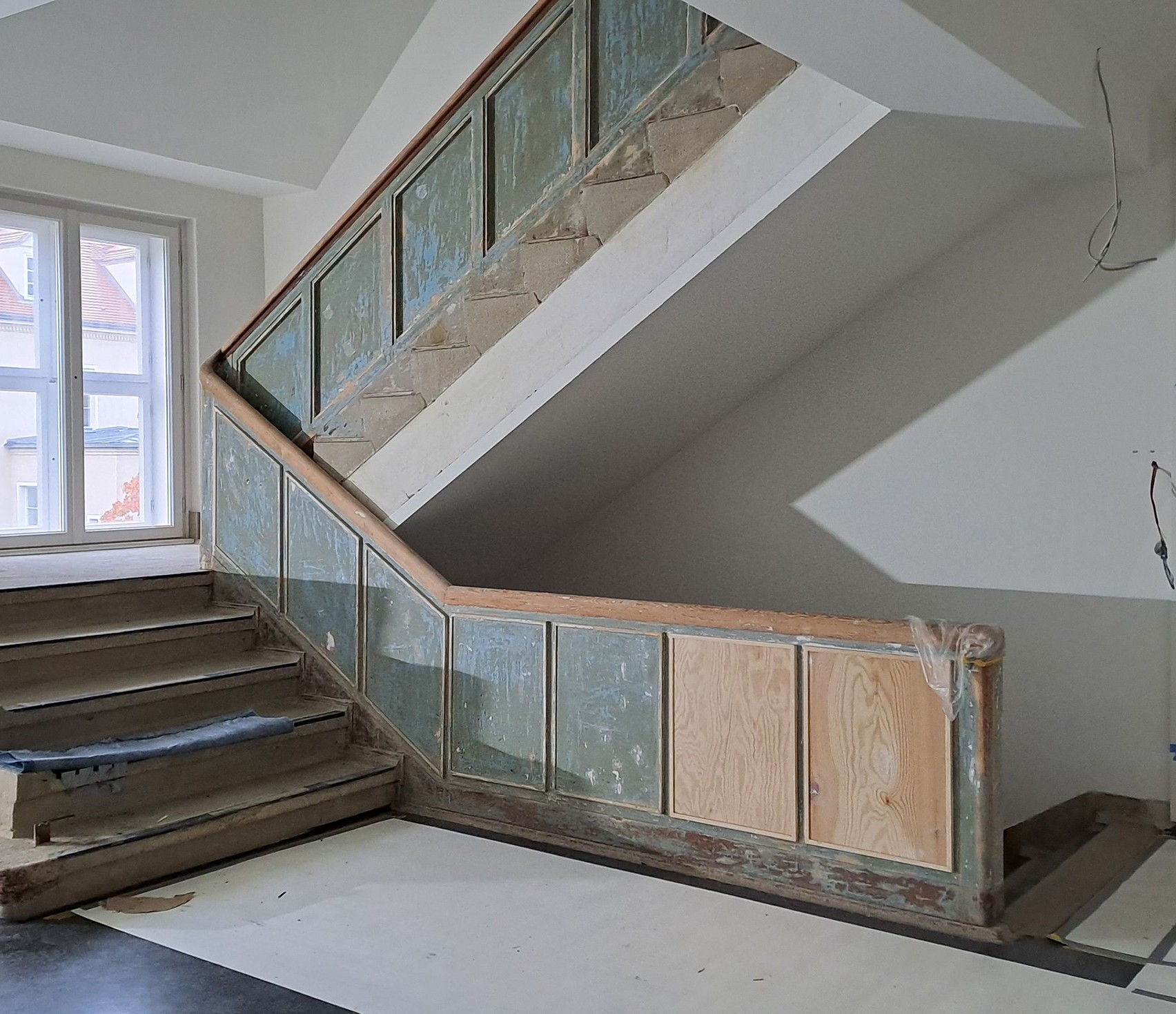 Auch im denkmalgeschützten Dachtragwerk des Ostflügels hat die Zeit ihre Spuren hinterlassen. Bereits 2016/2017 wurde das Dach notsaniert und einige originale Holzelemente des Dachstuhls mussten durch neue ersetzt werden. Im Februar haben die durch Alterung, Witterung und Ergänzungen gezeichneten Kroher-Binder im Foyer für einhomogenes Erscheinungsbild einen gelbfarbenen Anstrich bekommen. Die Elektro-, Wasser- und Fernwärmeleitungen wurden von der Straße her durch die Gebäude-Außenwände ins Haus geführt und mit einer Los-Festflansch-Konstruktion in Edelstahl an die Abdichtung angeschlossen, die an den Kellerwänden mit einer bituminösen Dickbeschichtung ausgeführt wurde.