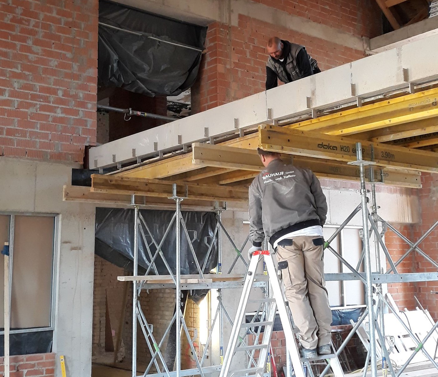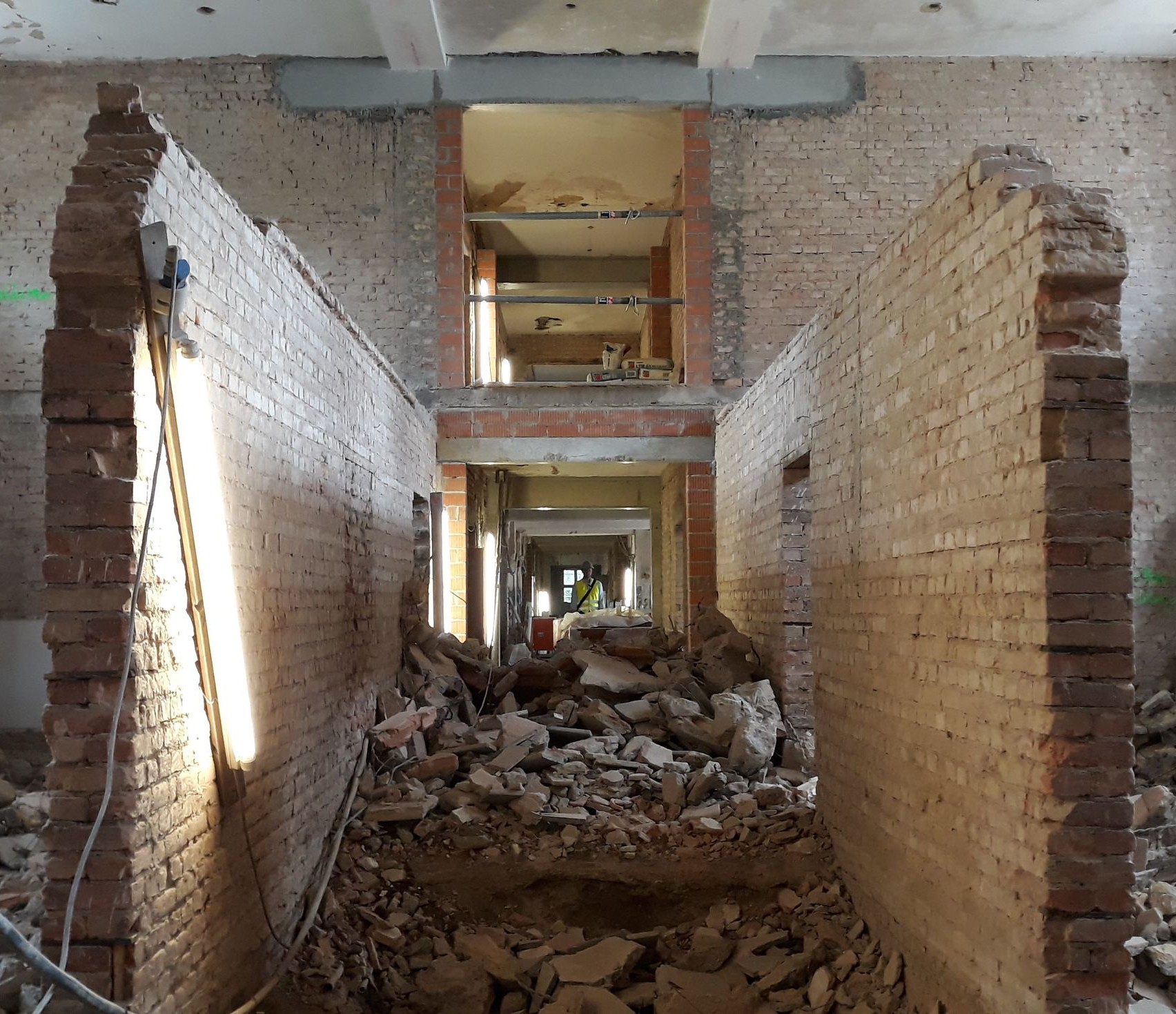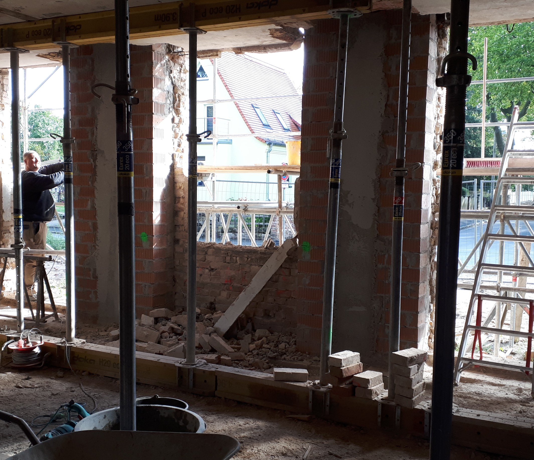 Momentan arbeiten drei Firmen gleichzeitig auf der Baustelle (technische Erschließung, leichter Abbruch und statischer Abbruch). Die BAUHAUF GmbH erbringt dabei die Bauhauptleistung, also den größten Teil der Abbrucharbeiten, und wird anschließend auch die Stahlbau- und die Zimmerarbeiten ausführen. Die Abbrucharbeiten in den Obergeschossen des Ostflügels erstrecken sich bis ins Frühjahr des neuen Jahres hinein.