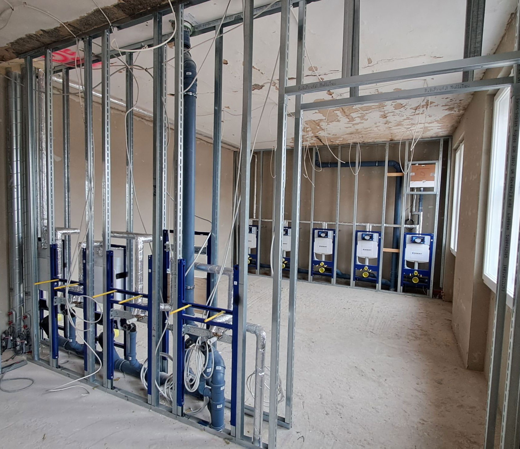 Die Errichtung der Ständerwerke der Trockenbauwände und –vorsatzschalen stand im März im Mittelpunkt der Arbeiten. Bevor die Ständerbekleidet werden, müssen zunächst alle haustechnischen Installationen vorgenommen werden. Die Sanitärinstallation hat mit der Montage der Register für die Sanitärobjekte begonnen, die Elektroinstallation erfolgt parallel. Ausgehend von den Lüftungszentralen im Dachgeschoss wurden Lüftungsleitungen zur Be- und Entlüftung aller Sanitärräume verlegt, ohne das denkmalgeschützte Dachtragwerk für Verzug oder Befestigung zu involvieren.