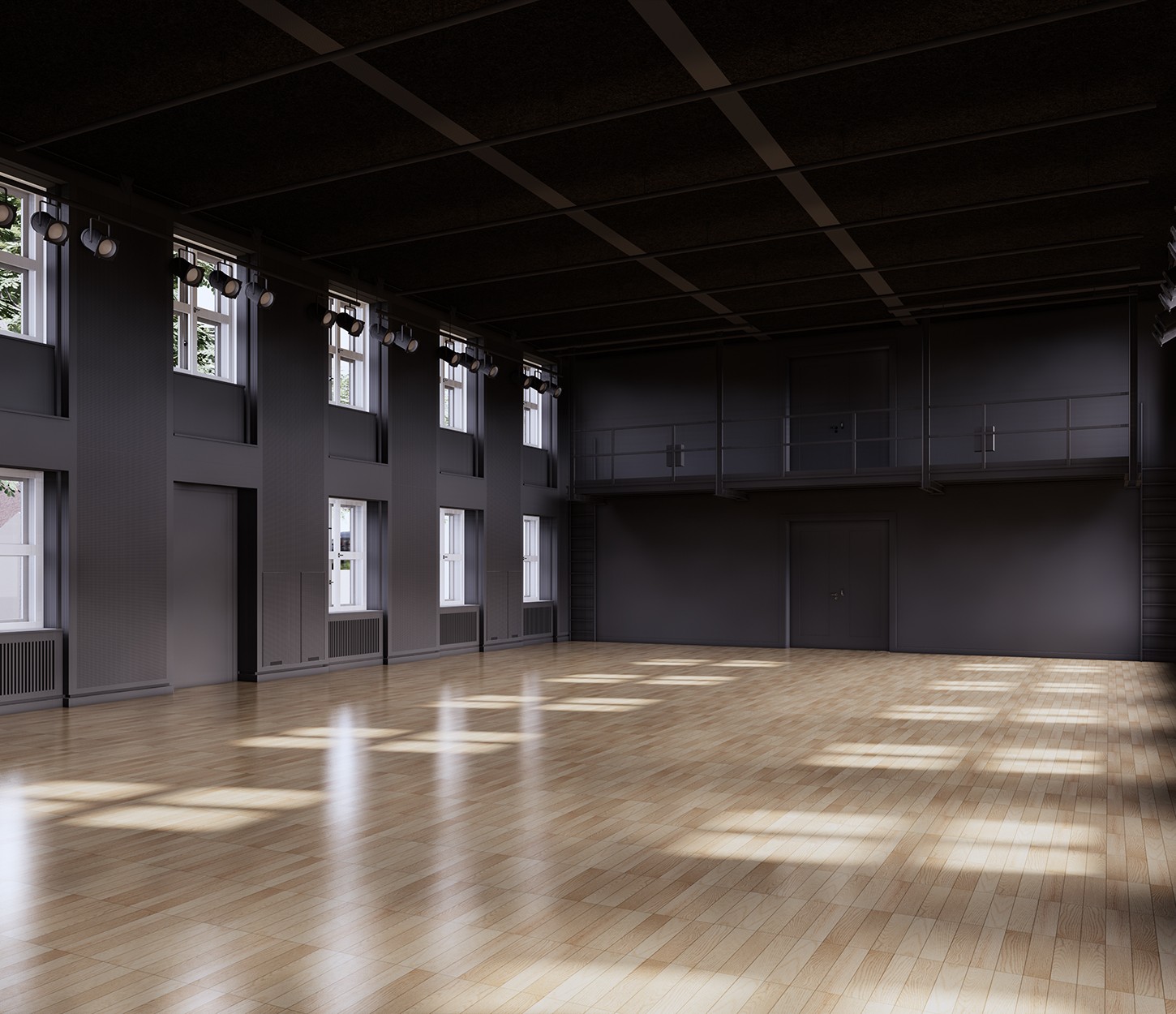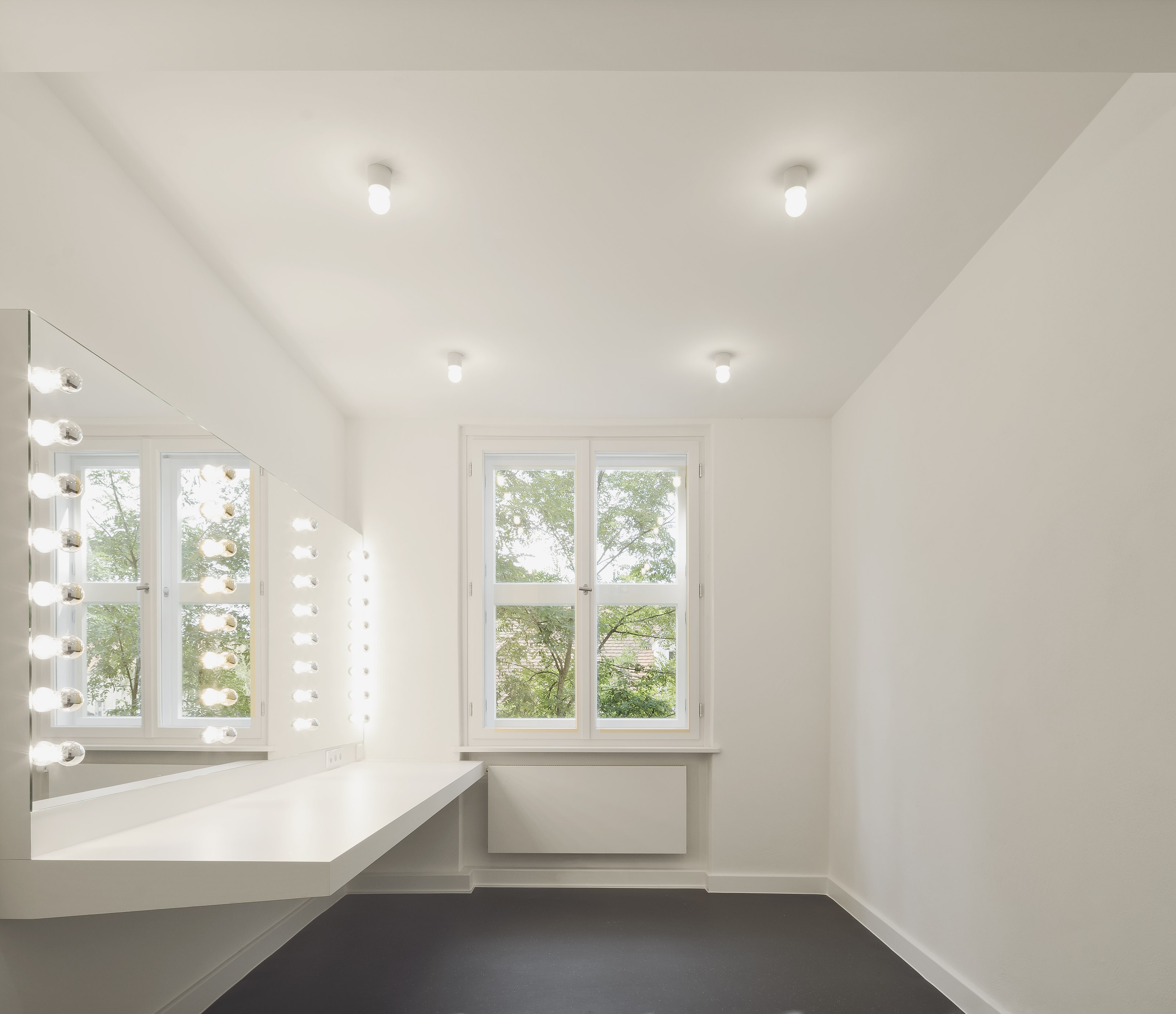 Im Probestudio werden zukünftig vor allem Tanzproben stattfinden. Dafür wird es als purer, weißer Raum mit minimalistischer Ausstattung hergerichtet. Die 16 historischen Fenster lassen viel Licht und Luft herein und geben den Blick auf das Festspielhaus frei. Durch die im August fertiggestellte Decke ist das Studio nun zur geplanten „White Box“ geworden. Die Studiodecke besteht aus Holzwolle-Leichtbauplatten (gerne auch „Sauerkrautplatten“ genannt), die sich aufgrund ihrer elastischen Fasern gut zur Schalldämmung eignen. In der Decke wurden Lasthaken installiert, an denen die Traversen für die Veranstaltungstechnik (Licht oder Ton) abgehängt werden können, sowie an den beiden Fensterseiten des Raumes durchgehende Führungsschienen für Vorhänge.