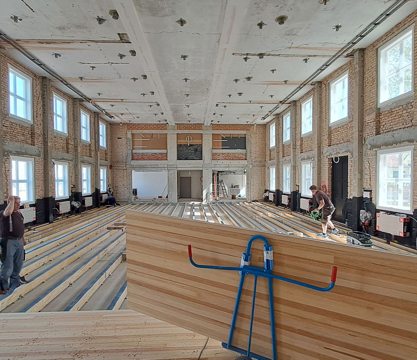 Der Mai stand ganz im Zeichen der „Bretter, die die Welt bedeuten“. Der Einbau des Bühnenbodens im Probestudio ist bereits abgeschlossen, der Bühnenboden in der Studiobühne ist in Arbeit. Von dem komplexen Fußbodenaufbau einschließlich der umfangreichen technischen Installationen bleibt nach der Fertigstellung nur noch die Decklage sichtbar – im Ostflügel besteht sie aus Brettern der Materialität Oregon-Pine mit einer Brettstärke von 50 mm. Im Boden versteckte Medienkästen, Kabelkanäle und -klappen sichern die medientechnische Versorgung für die verschiedenen Bespielungsvarianten der beiden Bühnen. Im Mai wurden außerdem die Unterhangdecken in den Garderoben fertiggestellt und in den Künsterresidenzen haben die Maler und die Fliesenleger mit der Arbeit begonnen.