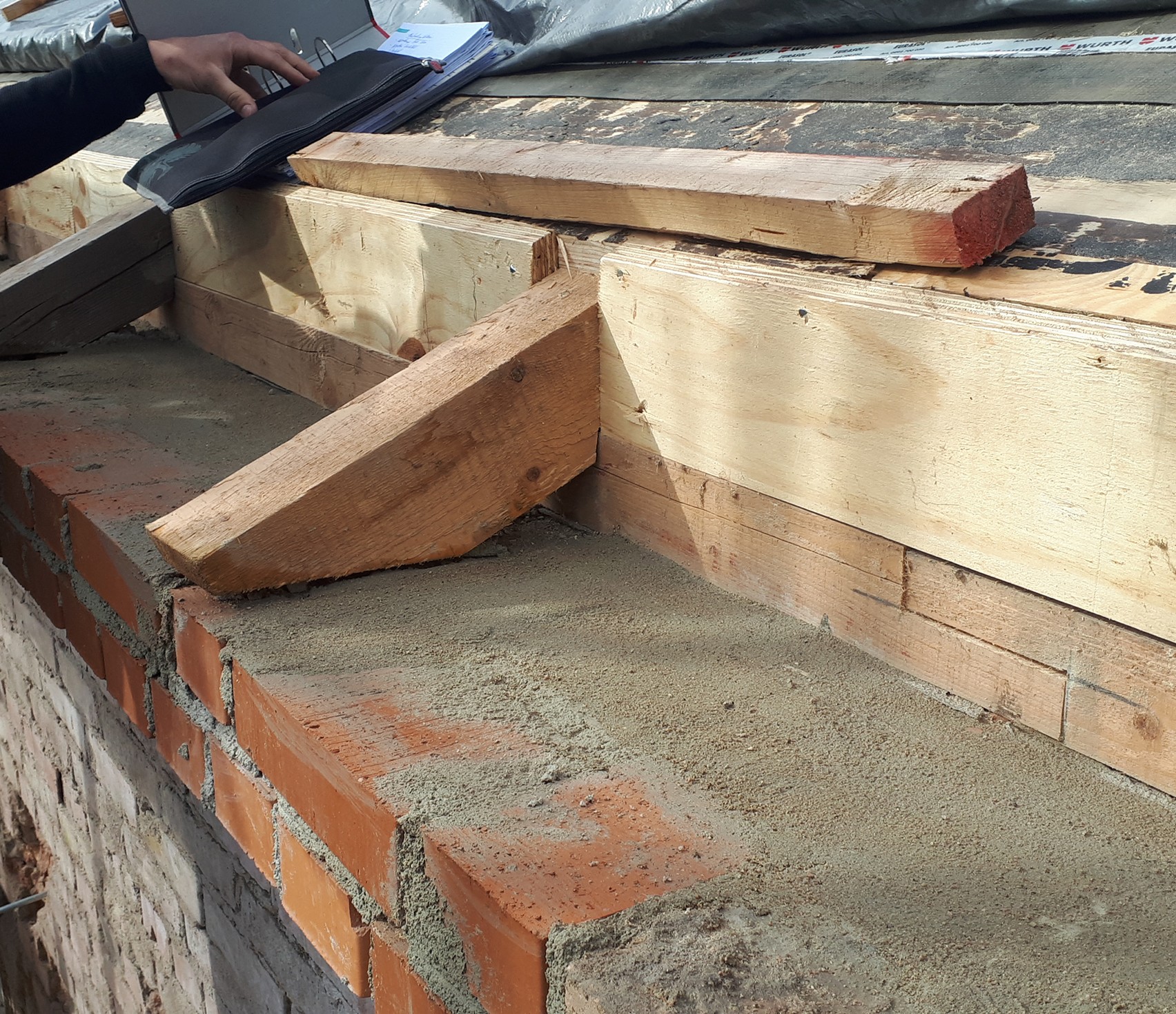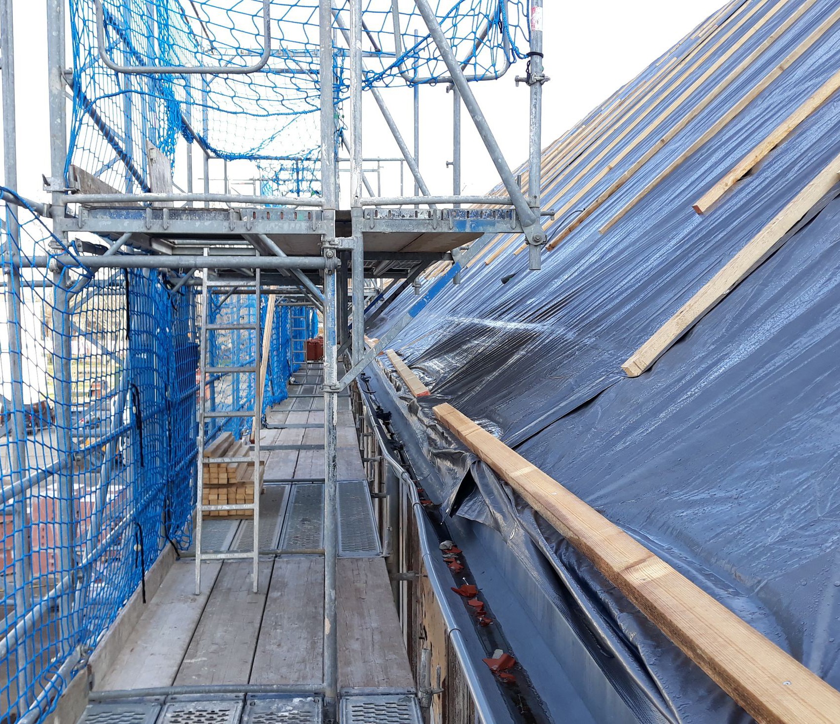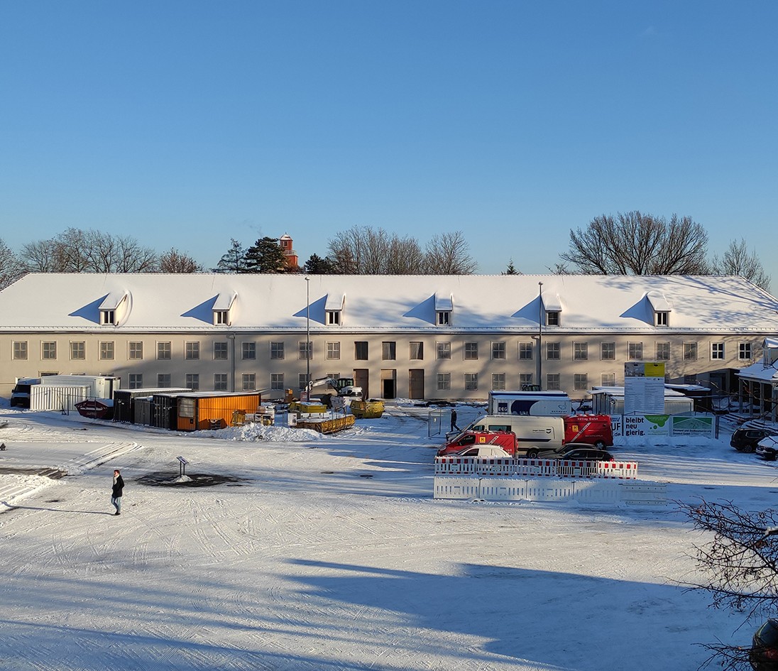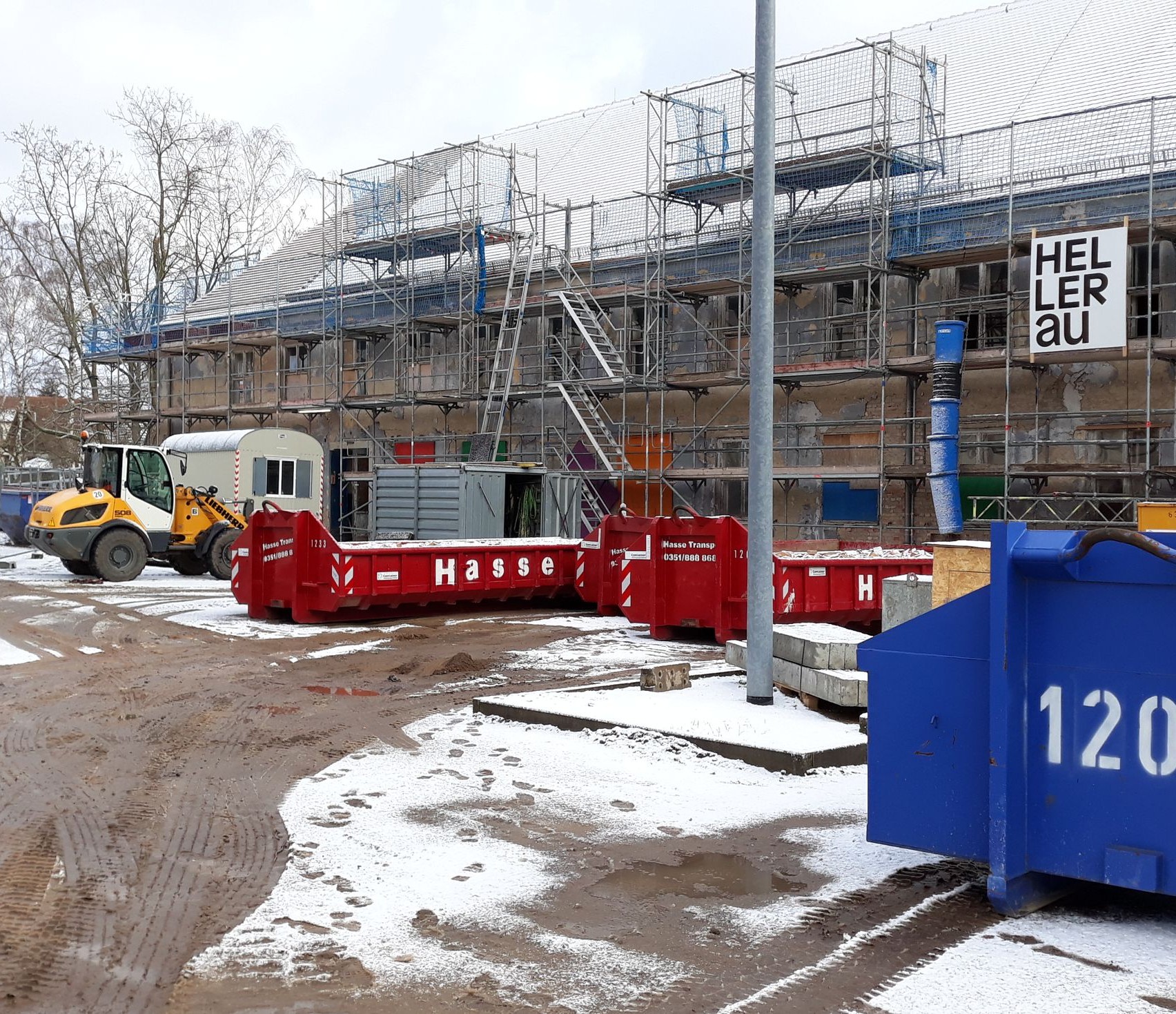 Pünktlich zu Weihnachten fiel der erste Schnee und bedeckte das Dach des nun eingerüsteten Hauses mit einem zarten Weiß. Auch im neuen Jahr schreiten die Abbrucharbeiten im Inneren des Ostflügels weiter voran und befüllen die riesigen blauen und roten Container vor der Westfassade mit Bauschutt. Die Türöffnungen der tragenden Innenwände werden der neuen Planung entsprechend angepasst und wenn nötig im Sturzbereich verstärkt. Außen haben Dachdecker begonnen, die Dachziegel abzutragen. Diese werden eingelagert und nach dem Einbau der neuen Dachgauben und dem Aufbringen der Dämmung wieder installiert.