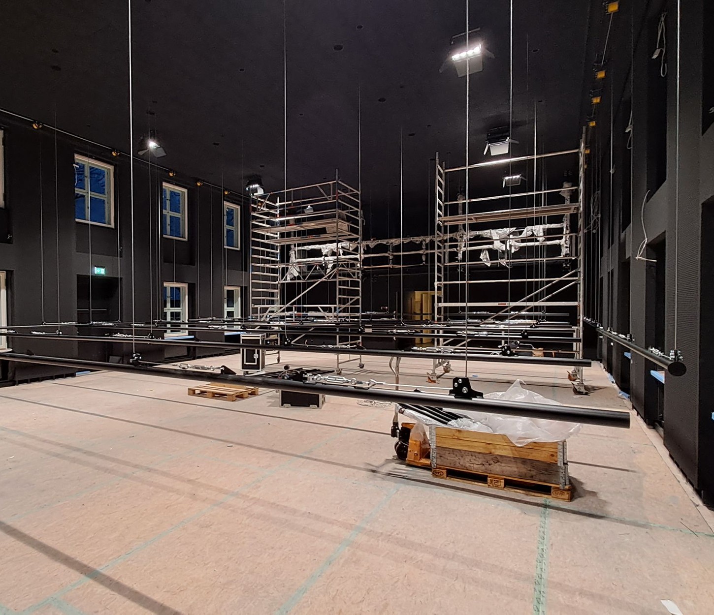 Die Studiobühne ist der größte Raum des Ostflügels – hier werden vor allem Aufführungen stattfinden. Dem großen Saal des Festspielhauses gleich wird auch die Studiobühne als frei bespielbares Raumgefüge ohne feste Einbauten ausgebildet. Dafür erhielt der Boden auf der gesamten Fläche Kabelkanäle und die Decke wird so hergerichtet, dass sie die Bühnentechnik flexibel aufnehmen kann. In über 200 Kernbohrungen wurden gelochte, außenseitig gedämmte Rohrhülsen eingebracht, durch die die Tragseile zum Rollenboden im Dach verlaufen werden.