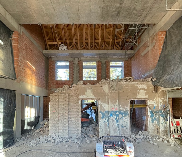 Es ist soweit! Der erste der beiden großen Säle des Ostflügels, in denen ab 2024 geprobt und performed wird, ist in seiner Rohform fertiggestellt. Im Mai wurden die Decke und die letzten verbleibenden Wände im Erdgeschoss entfernt – nun wird der Raum über insgesamt 16 Fenster auf zwei Ebenen in vier Gebäudeachsen belichtet. Die Montage der Stahlfachwerke über dem zweiten Saal, der Studiobühne, ist ebenfalls abgeschlossen. Jetzt schließen dort die Abrissarbeiten von Wänden und Decken an. Mit einer Länge von sieben Gebäudeachsen wird dieser Saal fast doppelt so groß wie das Probestudio sein.