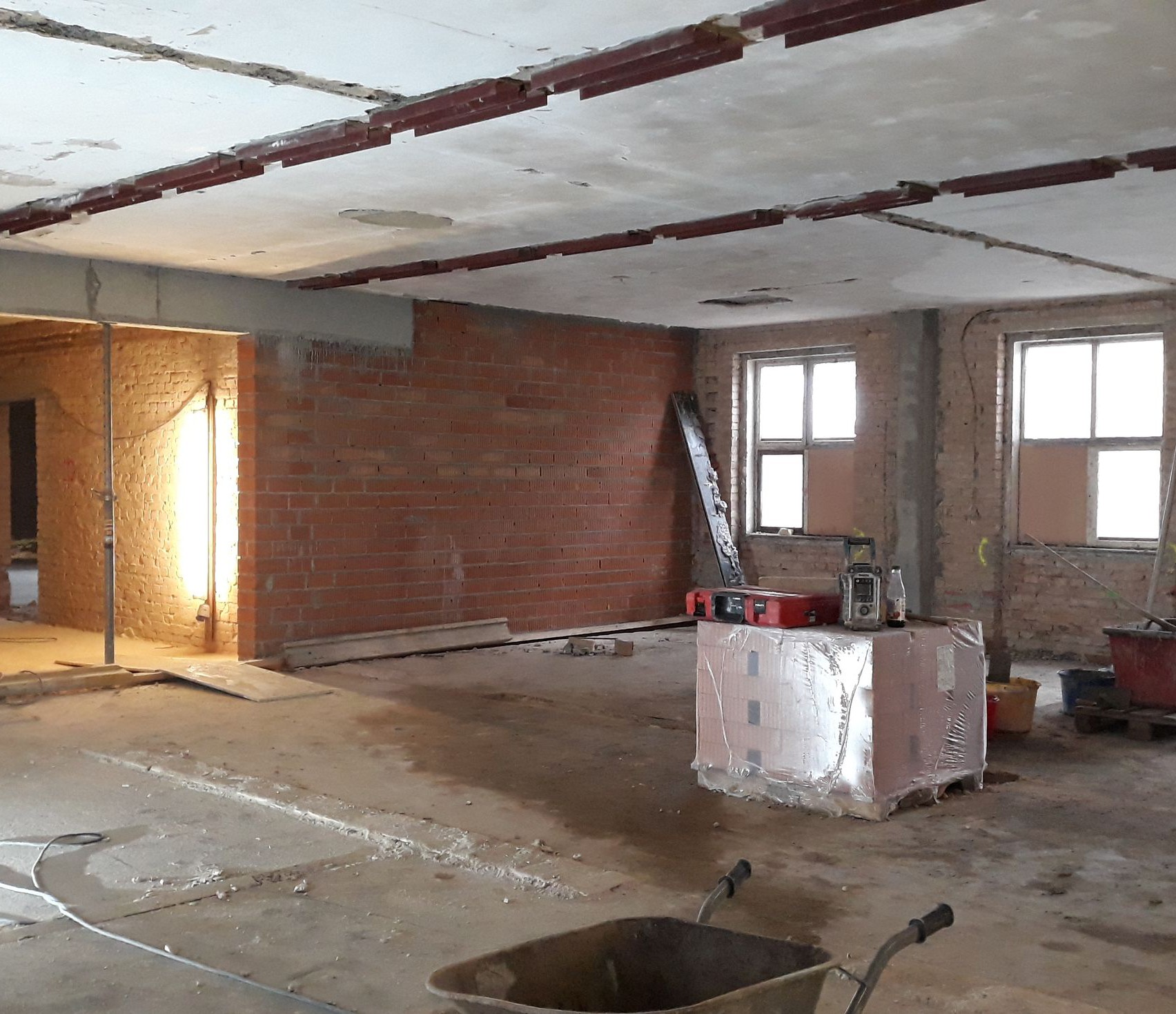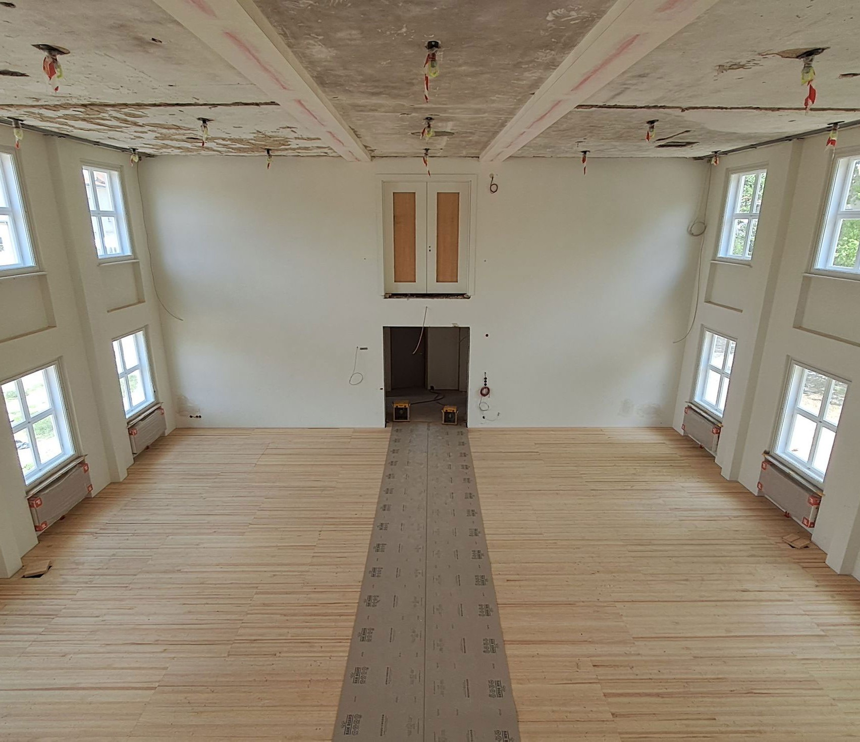 Nach der Rohbau-Fertigstellung des Probestudios im Mai ist nun die Studiobühne in ihrer Rohform fertiggestellt. Für diesen Saal wurde zunächst das Stahlfachwerk im Dach errichtet, dann die Decke über dem 1. OG daran aufgehängt und anschließend die tragenden Wände im 1. OG, die Decke über dem EG und die tragenden Wände im EG entfernt. Mit einer Länge von insgesamt sieben Fensterachsen ist die Studiobühne der größte Raum im Ostflügel des Festspielareals. Im August wurden das Dach weiter gedeckt und die Innenputzarbeiten im Probestudio fertig gestellt. In den Künstlerwohnungen und der Küche hat mit der Errichtung der Trockenbauwände und der Installation der Technischen Gebäudeausrüstung der Ausbau begonnen.