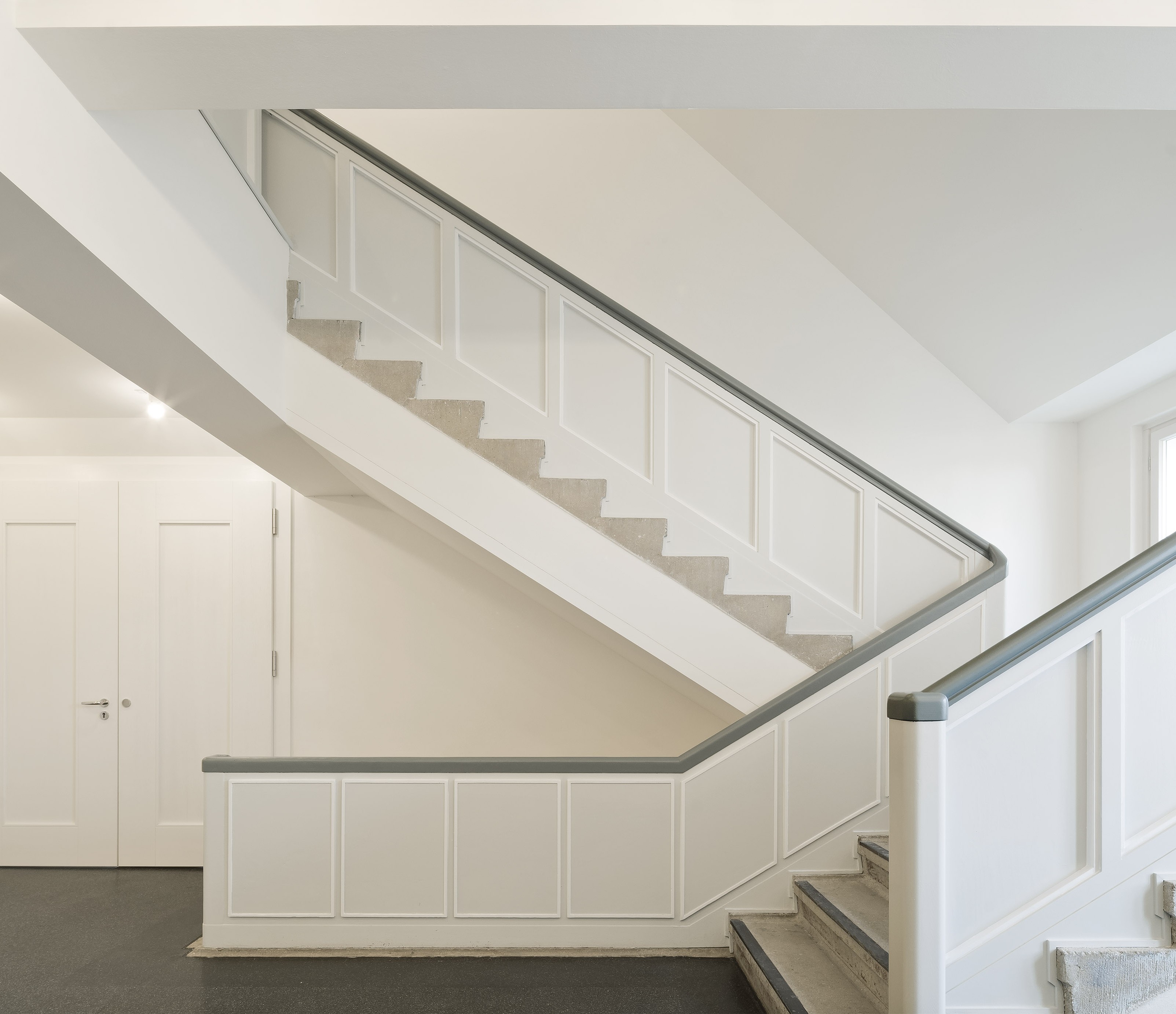 Neben dem Foyer und den beiden großen Sälen prägen auch die drei im originalen Zustand erhaltenen Treppenhäuser die Atmosphäre des Ostflügels. Besonders repräsentativ ist das Treppenhaus am Foyer, das die Eingangsebene mit den beiden Brückenebenen verbindet. Die originalen Stufen aus Betonwerkstein und Holzgeländer bleiben erhalten und werden restauratorisch aufgearbeitet.