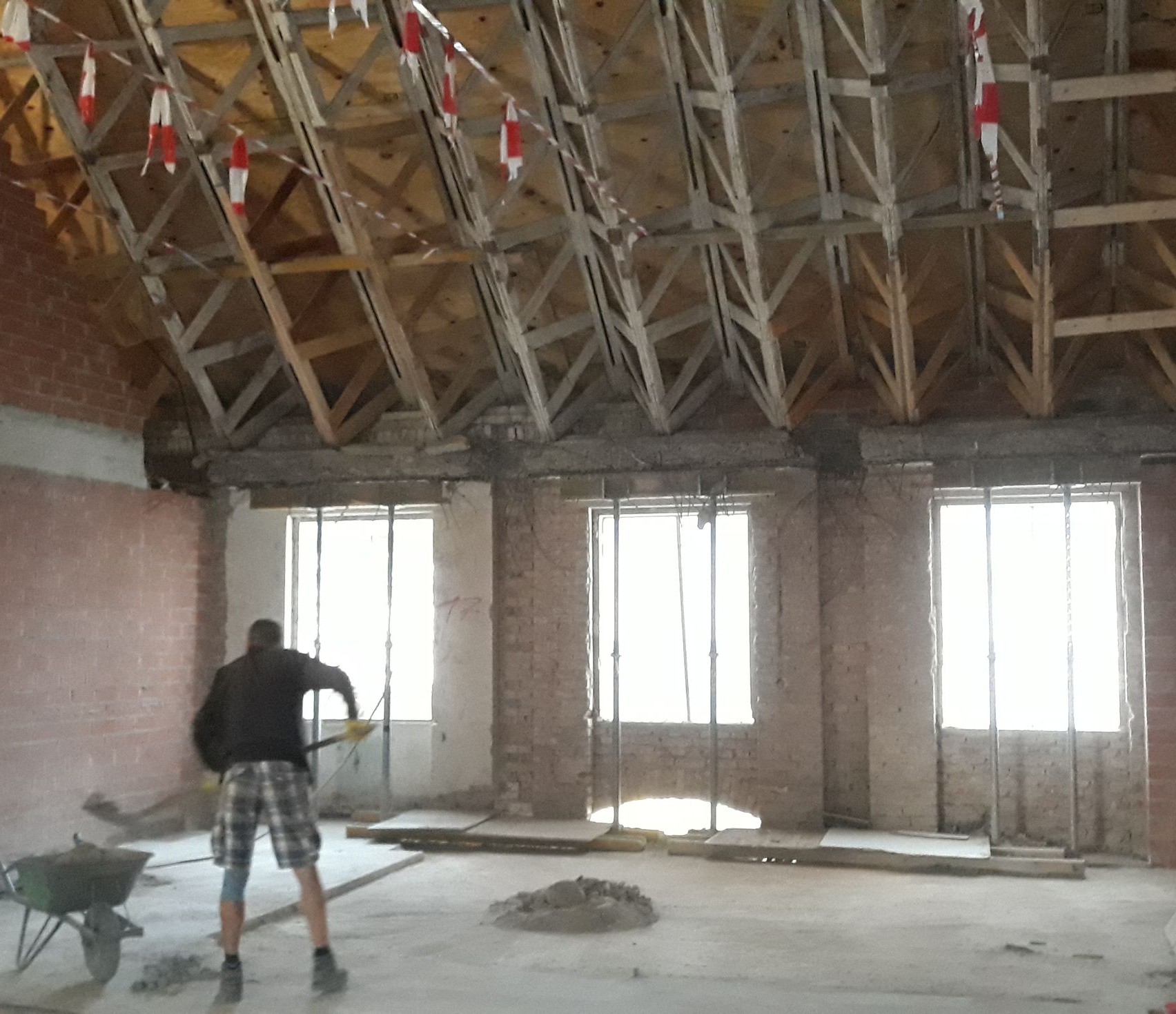 Mit dem Abbruch des Estrichs im Dachgeschoss sind die Abrissarbeiten am Ostflügel nun nahezu abgeschlossen. Auch die Dachziegel sind mittlerweile vollständig abgetragen und das Dach wird jetzt temporär über eine Plane gegen Witterungseinflüsse geschützt.