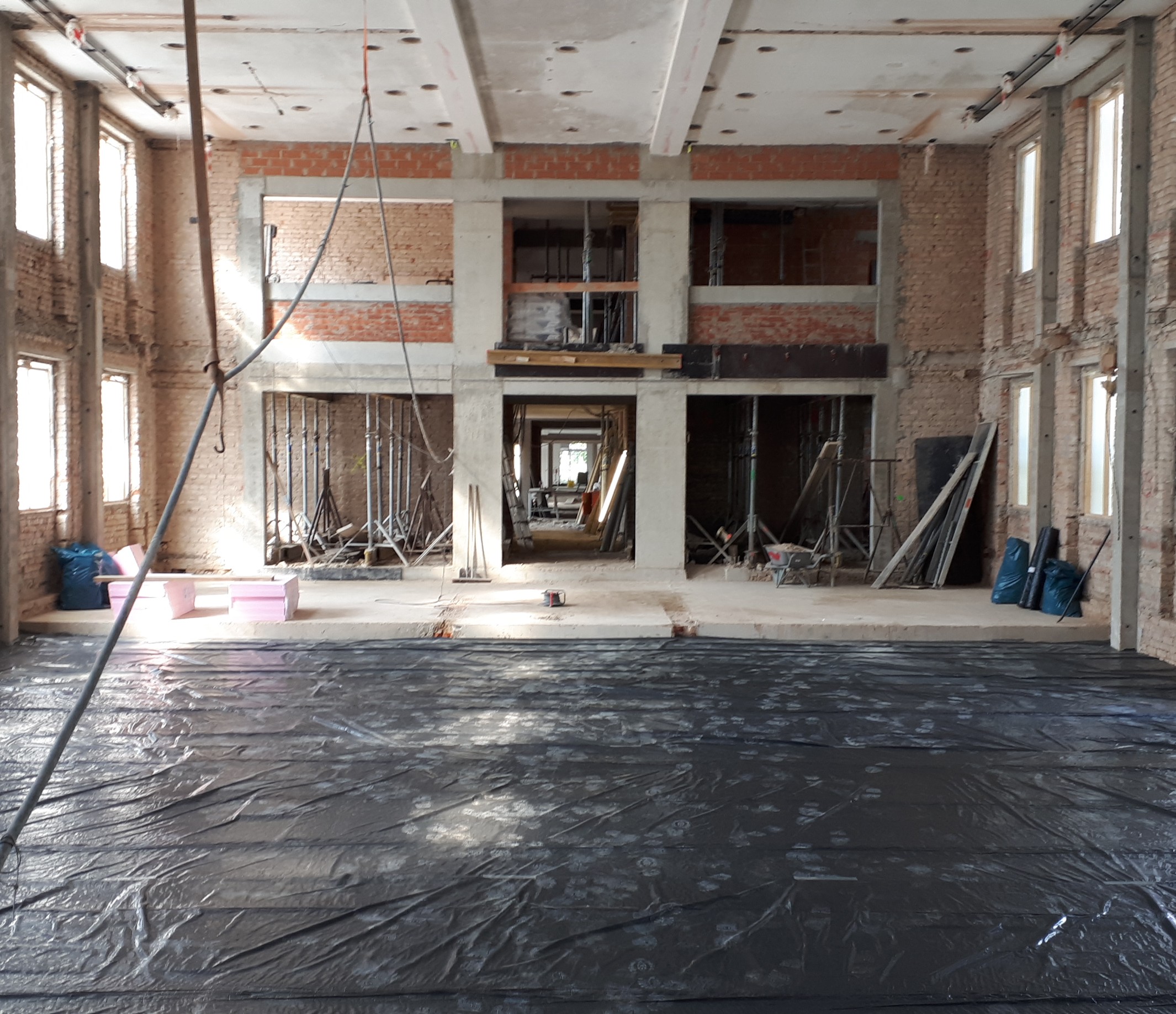 Im Gebäudeinneren ist der Rohbau des Foyers mit der Installation der zweiten Brücke abgeschlossen und die Bodenarbeiten haben begonnen. Alle repräsentativen Bereiche des Ostflügels, mit Ausnahme der beiden Bühnenräume, erhalten einen Boden aus geschliffenem Gussasphalt – ähnlich dem im Besucherzentrum des Seitengebäudes West.